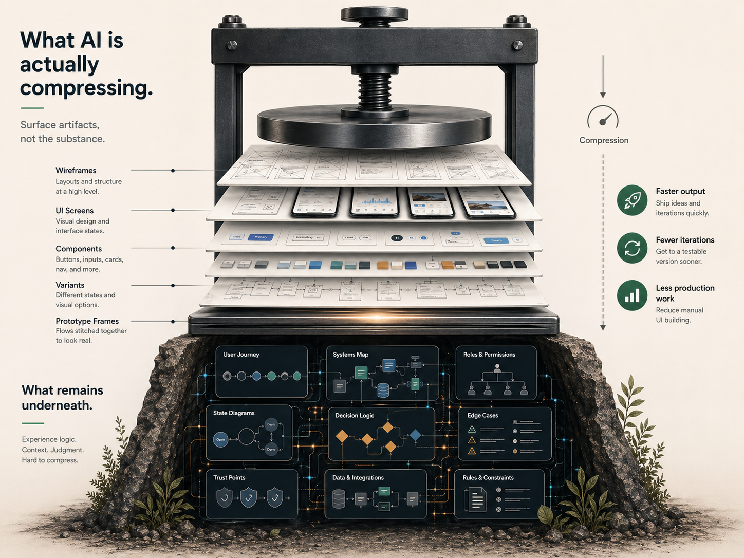 A lot of the visible layers of UX/UI work are getting compressed: wireframes, screens, components, variants, prototype passes, and cleanup. AI is getting much better at accelerating that layer.