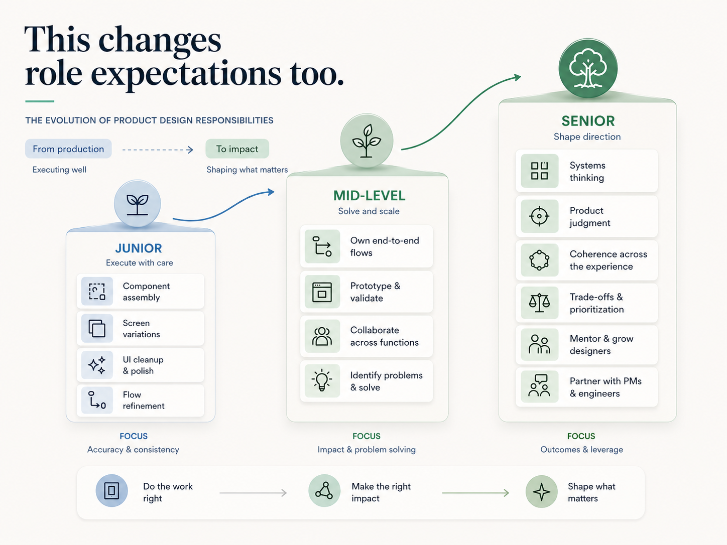 That shift also changes role expectations. A lot of the work junior designers were often expected to do, like refining modules, assembling components, producing variations, and cleaning up flows, is exactly the kind of work these tools are starting to compress first. That doesn’t mean junior designers matter less, but it probably does mean the path into the field is changing.